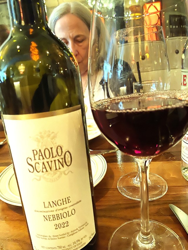 In between my two courses, I had the pleasure to meet the Sommelier at the restaurant and she was trying to have me join their Champagne Society, but I was still fuming about the insult that I took, so I really wasn’t interested in future activity with Mabel Gray. Our “waitress” told us that a lamb entrée was only offered to the Tasting Menu customers, so my Bride offered me that dish, but I also ordered their Griddled Baja Blue Fin Tuna with summer peperonata, crispy potato, arugula and herb salad. My Bride had also booked the dinner, telling them that I was having a birthday and the restaurant also sent out their version of a Baked Alaska, that we all shared. The wine list paled in comparison to the Champagne Society selection, but I opted for a red, in anticipation of the lamb entrée, and it was good that my dish was to be shared for two. I ordered a glass of Paolo Scavino Langhe Nebbiolo DOC 2022. Paolo Scavino was founded in 1921 in Castiglione Falletto by Lorenzo Sacavino and his son Paolo. Enrico Scavino has been working at the winery sine 1951, at the age of ten, and he now manages the estate with his daughters, who are now the fourth generation. The estate has twenty-three hectares entirely in Barolo, including lots in nineteen different Cru Vineyards. The Langhe Nebbiolo is pure Nebbiolo grapes coming from sites that the winery says enhances the more ethereal Nebbiolo aromatics and structure. The wine undergoes fermentation at a low temperature, to ensure a soft extraction. The wine then has a short period in neutral oak and then finishes the aging in Stainless-Steel to preserve the freshness of the grapes. The ruby-red wine offered notes of red cherry, raspberry and strawberries along with violets, white pepper and herbs, licorice and sous-bois. On the palate the medium-bodied, well-balanced wine displayed tones of cherry, raspberry, strawberry, plum, blueberry, and spices blending with supple tannins and ending with a medium-count finish of fruit, florals and terroir.