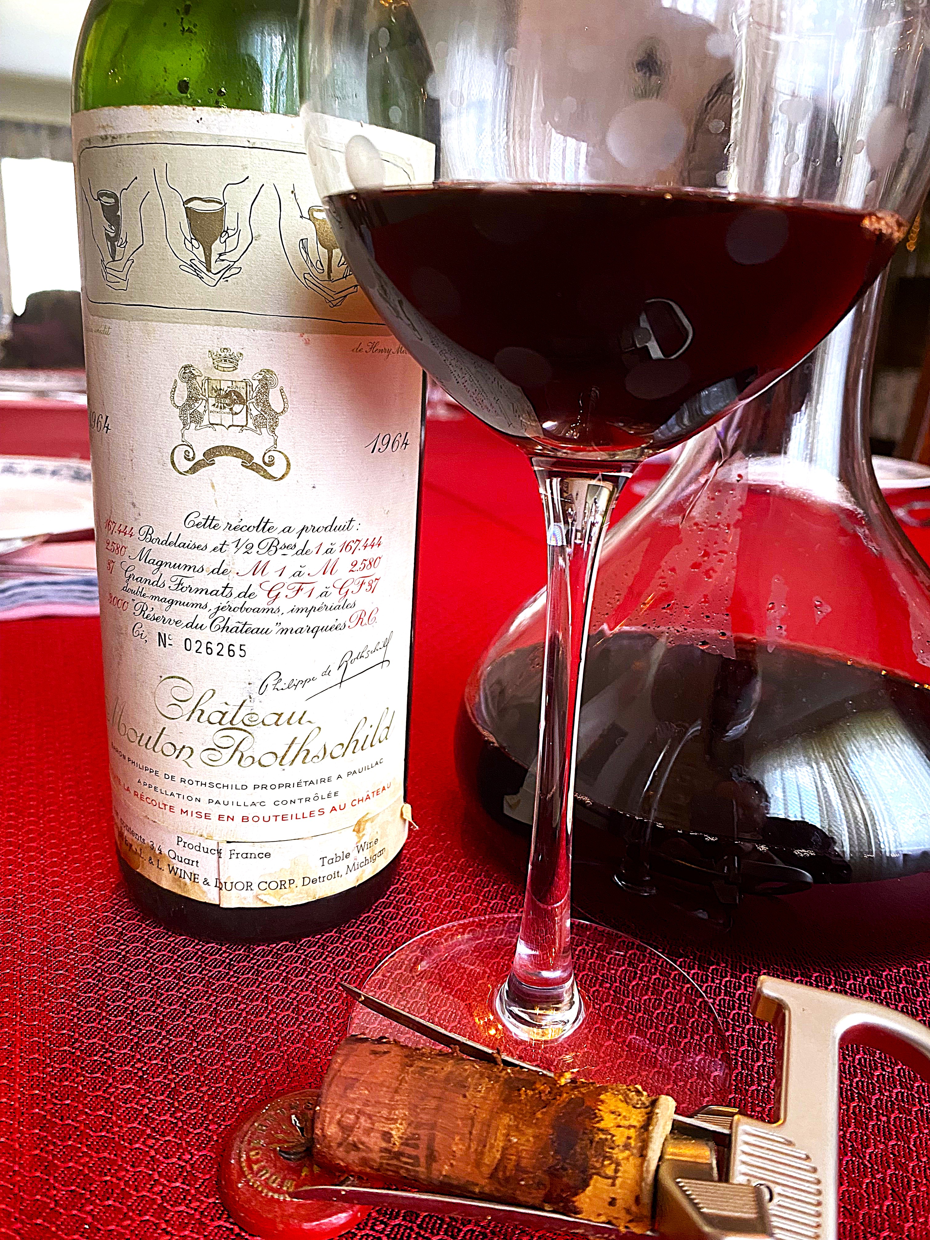 I did open my Chateau Mouton Rothschild Pauillac 1964 with a label of distribution by Dourthe Freres, Negociants a Moulis-Medoc (Gironde). For those old enough, you may notice that there is no indication that Chateau Mouton Rothschild was even part of The Classification of 1855 for the Medoc. They were listed as the First of the Second Growths, and they felt that because of politics, they weren’t listed as a First Growth, this was later corrected in 1973. The chateau was originally Brane-Mouton and was among the best of the 18th and 19th Centuries, and then the quality fell in the 1840s. The property was then bought and renamed in 1853, and the quality was restored, but not in time for The Classification. Baron Philippe de Rothschild took the reins in 1922 and introduced chateau bottling in 1924. At the end of World War II, they began commissioning a different artist for each vintage and the 1964 label is by the English artist Henry Moore. The estate is eighty-four hectares on gravelly soil. The estate is planted at eighty percent Cabernet Sauvignon, sixteen percent Merlot and small plots of Cabernet Franc and Petit Verdot; the average age of the vines are about forty years of age. The fruit is hand-harvested, undergoes fermentation in oak vats and then is aged for eighteen months. I decanted the wine for about two hours prior to dinner, and the wine was still a rich garnet-ruby to dark brick color with no visible foxing and offered notes of dark cherries and blackberries, mushrooms, old leather, earth and spices; though initially hesitant, the nose became much more striking after the first hour and even better at the second hour. On the palate this full-bodied, well-balanced wine still displayed tones of tart cherries, dried fruit, spices that blended with fully integrated tannins with still some refreshing acidity that ended with a long-count finish of fruit and rich minerally terroir. I am glad that I had it now, though I am sure that it would have been strong for another five years.