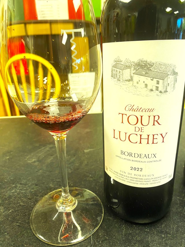 The first wine was Chateau Tour de Luchey Bordeaux 2022. This estate is located in the district of Moulon on the banks of the Dordogne River. On the grounds of the estate is a medieval tower, and years ago, “Luchey” meant the King’s usher who would check the ship’s loading leaving for France’s King, via Bordeaux. The estate has been in the same family for five generations. It is a little more that sixteen hectares of forty-year-old vines on silty soil and predominately Merlot. This vintage is eighty percent Merlot, ten percent Cabernet Franc and ten percent Cabernet Sauvignon. The fruit is both mechanically and hand harvested. Each varietal is picked and vinified separately in Stainless-Steel and concrete vats and thermal-regulated for about fifteen days; and then the wine is aged in Stainless-Steel vats. This deep claret colored wine offered notes of red cherry, raspberry and strawberry. On the palate this medium-bodied and well-balanced wine displayed tones of fresh red fruits and blackberry blending with ripe tannins with tones of chocolate and coffee and ending with a medium-count finish of fruit.