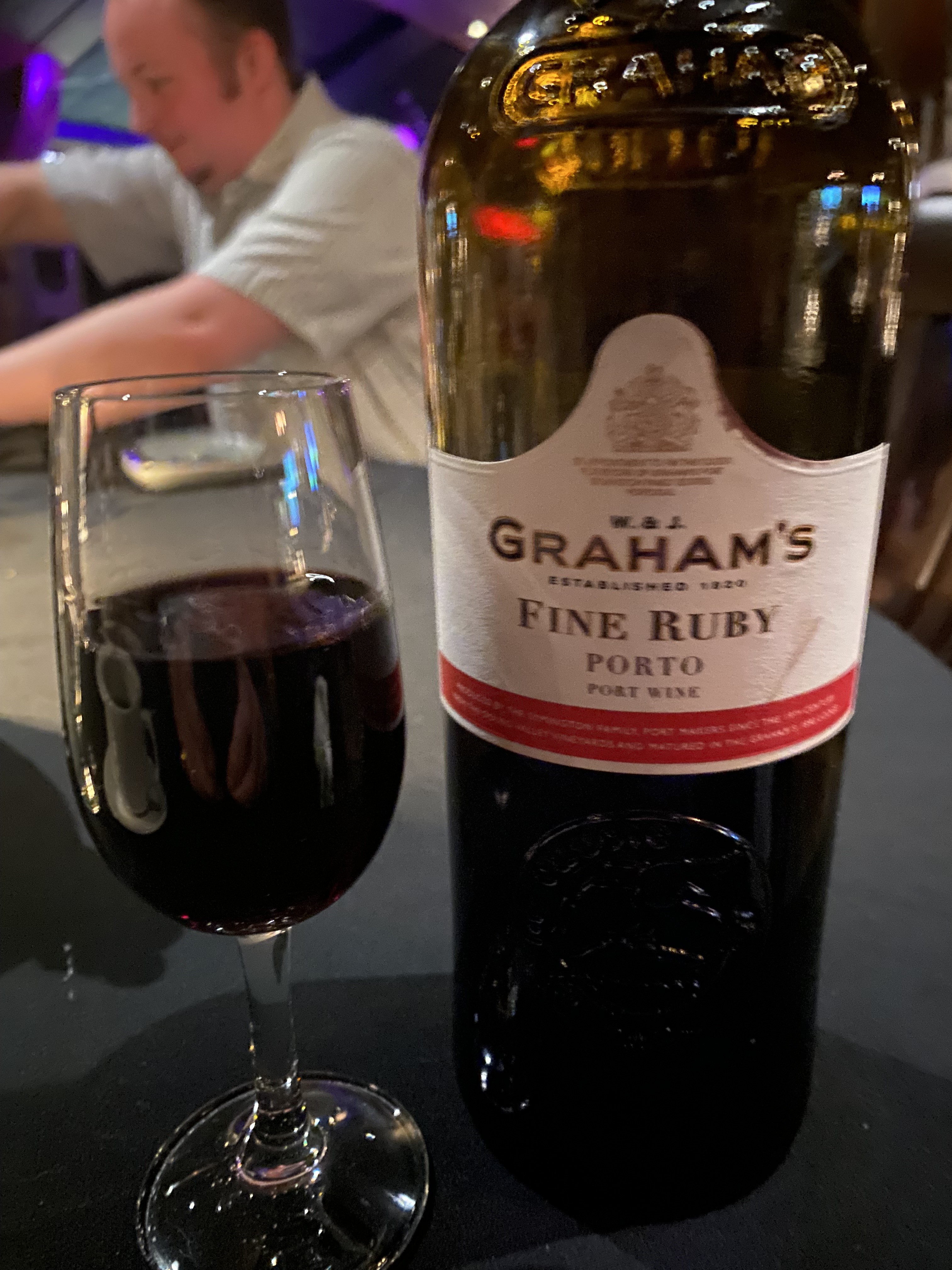 After dinner, my Bride and the others had coffee and dessert with my Bride having the Chocolate Ganache Torte with a Sea Salt and Walnut Crust drizzled with Strawberry Caramel and topped with Walnut Granola. I snuck a couple of spoonfuls from my Bride, and I let her have some of my dessert of choice. I have to admit that in the last twenty-some-odd years, I have developed a fondness for after dinner wines. I had a glass of W&J Graham’s Fine Ruby Porto NV. Graham’s is a prominent Port house in the Douro Valley of northern Portugal and began as a textile company in the early 1800 by William and John Graham of Glasgow and they received a barrel of Port as payment for a debt, and the business began. Today Graham’s is owned by the Symington family that also owns other Port houses, including Dow’s and Warre’s. Ruby Port is the most extensively produced port wine and is a blend of young wines from multiple vintages. There is no official designation for Ruby, though the industry has agreed in principal that it is youthful, fruit-forward and a bulk-produced wine. The most common varieties used are: Touriga Nacional, Touriga Franca, Tinta Barroca, Tinta Roriz (Tempranillo) and Tinta Cao. This Port wine is bulk-aged in cement or Stainless-Steel tanks to prevent oxidization to maintain the fruit-forward qualities; and they are not made for additional aging. This ruby-red colored wine offers notes of red and black fruits. On the palate this medium-bodied, well-balanced wine displayed tones of black cherry and ended with a medium-count finish of fruit.