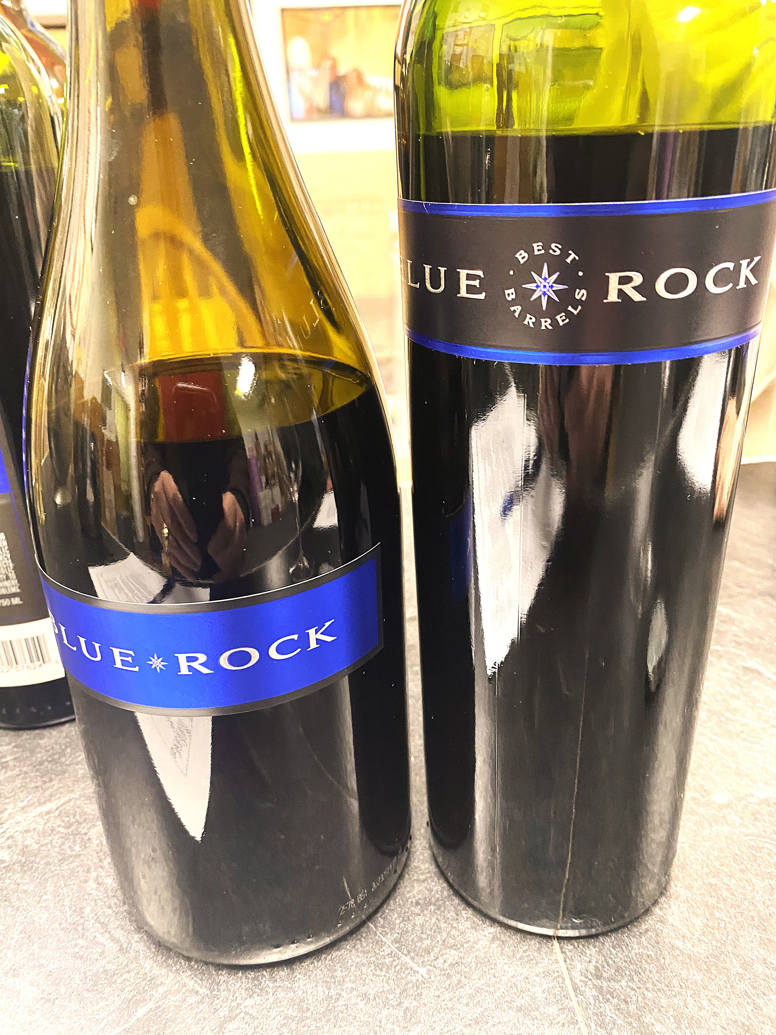 The first red wine of the tasting was Blue Rock Winery “Black Label” Best Barrels Pinot Noir Gapstone Vineyard, Petaluma Gap Alexander Valley Sonoma County 2022. You may have noticed that I have been showing photos of the back of the bottle labels, as the winery to conserve expenses, which is wise, has either a blue label or a black label that proclaims Blue Rock Winery, and the “Black Label” designates their Best Barrel wines. This wine was selected from a four-barrel selection that features two Pinot Noir clones. Seventy-five percent is Swan Clone noted for low yields, small berries and velvety texture, while twenty-five percent is Calera Clone known for its age-worthy tannins. The wine is pure Pinot Noir and was fermented and aged in French Oak, of which fifty percent was new, for ten months, with an additional five months in the bottle before release. The four barrels produced eighty-eight cases. The deep burgundy colored wine offered notes of raspberry, black cherry, and violet florals. On the palate the medium-bodied, well balanced wine displayed tones of black cherry, plums and pomegranates along with balsam, dark chocolate and gravel that ended with a medium to long-count finish of fruit and terroir. Unfortunately, I didn’t take a photo of this wine, so I am showing the two front labels.