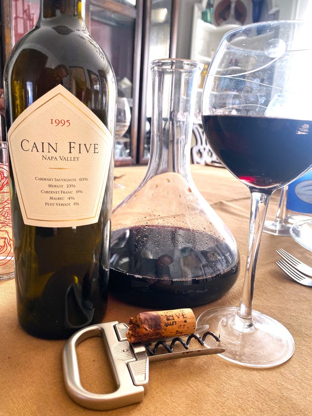 Then came the main entrée which was Braised Short Ribs of Beef with Root Vegetables and of course Armenian Pilaf (this is almost a given for any dinner at our house, as it is expected. Two hours before dinner was expected to be served, I decanted probably her favorite winery’s flagship wine Cain Vineyard and Winery Cain Five Napa Valley 1995, and from a vintage two years after we met. In 1980 when Jerry and Joyce Cain purchased the property which would become the mountain vineyard, the vineyard was dedicated to Cabernet Sauvignon, Cabernet Fran, Merlot, Malbec and Petit Verdot. The fruit inspired the name Cain Five and the first vintage was in 1985, the winery was originally “Cain Cellars” and their first crush was in 1982. Cain is a mountain winery, and they pride themselves on the fact that the fruit is hand harvested, so they can actually pick the grapes at the proper individual time, because the vineyards are too steep for machinery. The fruit for Cain Five is all from one vineyard, estate grown and estate bottled. We bought this bottle at the winery when we did a tasting. I did ask why they don’t refer to the wines as a Meritage; they informed me that they were doing this prior to the creation of the Meritage association, and that they felt there was no reason for them to be a member. The wine is sixty-three percent Cabernet Sauvignon, twenty-three percent Merlot, nine percent Cabernet Franc, four percent Malbec and one percent Petit Verdot; and they came from sixteen lots that were vinified separately. The wine was aged for twenty-two months in French Oak. This was a very deep purplish-black colored wine that offered notes of black cherry, blackberry, black currant, and ripe plums with secondary notes of chocolate, cedar, and pencil shavings and no foxiness. On the palate this full-bodied, well-balanced wine “chewy” wine displayed tones of ripe dark fruits blending perfectly with now savory and mellow tannins, ending with a nice long-count finish of ripe fruit, spices and still plenty of terroir. My Bride at first objected to my opening one of her prized and esteemed bottles, but after tasting it, she was glad that it was so elegant as a thirty-year-old.