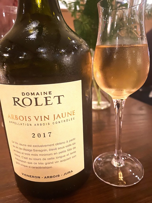 For dessert with multiple spoons supplied there was Bonet featuring chocolate, honey caramel, dark chocolate crumbs and hazelnuts as well as an order of Apfelkuchen which was an olive oil and thyme cake with Honeycrisp apples, maple cardamom, sage and an apple butter sorbet. I also ordered a glass of Domaine Rolet Pere et Fils Arbois Vin Jaune Jura 2017 to share. Domaine Rolet was created in 1942 and was produced by two generations, who then sold the estate in 2018; they produce all the classic wines from the Jura. Vin Jaune is only produced in the Cotes du Jura, Arbois and Arbois-Pupillin. It is made with Savagnin grown on blue and gray marls, manually harvest late in the season, which can produce a high alcoholic content by volume. After fermentation the wines are transferred to oak barrels and left, untopped for a minimum of six years and three months, similar to the production of the fortified Fino and Manzanilla wines. The wine is exposed to oxygen in the barrels and develops a layer of yeast on the surface officially called “gout de jaune” or “taste of yellow” (like the “flor” in Jerez). This is a wine that has a very long life. A bronze-yellow wine with notes of dried fruits, spices, almonds, hazelnuts, walnuts, pepper, morels and minerals. On the palate this full-bodied, delicate acidity displays tones of complex flavors of candied and dried fruits, nuts, and spices ending with a long-count finish of sous-bois and minerality. My Bride and our friend did not like this wine, as I think oxidized wines tend to have immediate fans or they are on the other side of the table.