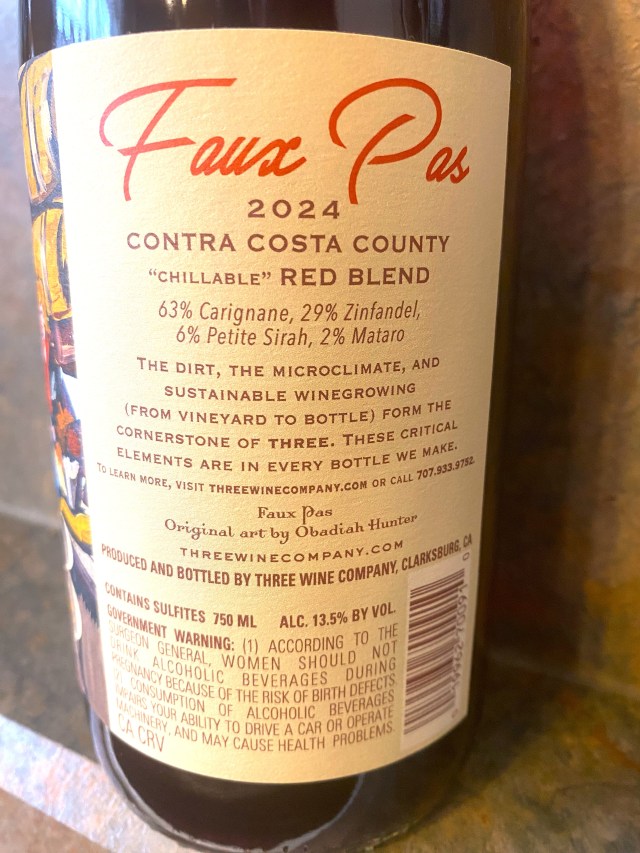 The second club entry was Three Wine Company Faux Pas Contra Costa County 2024, that is “chillable,” and their sentiments are “the dirt, the micro-climate and don’t screw it up.” Winemaker Matt Cline’s philosophy is that the dirt, the micro-climate, and sustainable winegrowing form the cornerstone of good winemaking, and he places them in every bottle of wine he produces. He has a passion for preserving and educating on the historic varietals to California, such as Zinfandel, Mataro and Carignane. He and a like-minded group stood up to the State and saved an historic vineyard. This wine is a blend in two ways, first the wine is a blend of sixty-three percent Carignane, twenty-nine percent Zinfandel, six percent Petite Sirah and two percent Mataro. The Carignane is from the Joaquin Jose Vineyard which was planted in the mid-1880’s with an average age of over one-hundred-thirty years. The Zinfandel came from the Vineyard Lane and Oakley Road Vineyards. The Petite Sirah is from the Mazzoni-Live Oak Vineyard planted also in the mid-1880’s of which only 1.9 acres remain but is part of the seven-acre portion of the vineyard that is planted to the same varietal. The other part of the blend of this wine is that it is a blend of rosé and red wine lots fermented in Stainless Steel tanks. The rosé portion is a blend of mostly Zinfandel with some Carignane with about twenty-two hours of skin contact and fermented for forty-two days. The red wine portion had the Carignane fermented on its skins for thirty-one days, while the Petite Sirah was fermented for fifteen days. All the lots were unfined, and once the blending was complete, the wine was aged for four months in Stainless Steel. This wine is suggested to be lightly chilled before serving. According to the notes, this light crimson colored wine wine offers notes of Bing cherry, raspberry and pomegranate. On the palate this medium-bodied, well-balanced wine displays tones of fruit, a touch of minerality and fine acidity, ending with a medium-count finish ending with a dominate finish of cherries. It is suggested that if you drink this wine during the summer months that a slight chill to the wine will make it feel more refreshing.