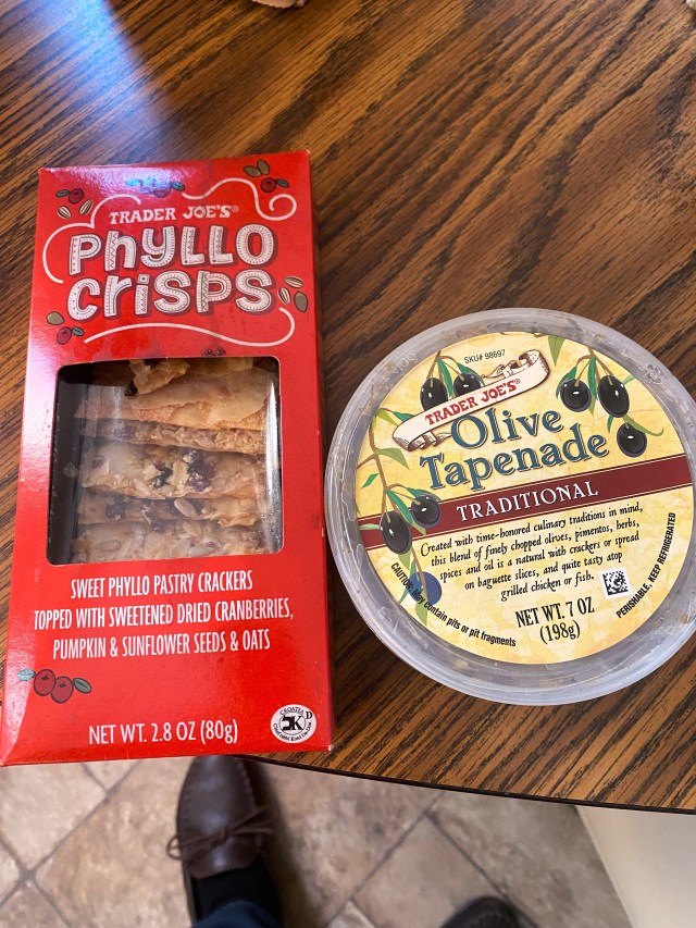Now on to the subject of samples, some wine bloggers seem to have a propensity to obtain samples, I an rather laid-back on the subject, though it is flattering. I have a separate heading for “Samples” on my blog, that I direct firms to read, before we have too many discussions. Last month, one winery decided against sending me some samples and another winery that I have written about in the past asked for permission and sent me another bottle. As in the past, this winery sends me a bottle of wine and some wine crackers, this time the package came during my medical problems, so we just left the shipping unopened and stored it in the garage, which at this time of the year is like putting it in the refrigerator. I am not sure if the importer, warehouse agency sent me the wrong stuff or not, as I was expecting a bottle from the Loire Valley, instead I received a store brand wine from Cairanne (Rhone Valley) and some delightful Trader Joe’s Phyllo Crisps topped with dried cranberries, pumpkins and sunflower seeds and oats. There was also a tub of Trader Joe’s Olive Tapenade, so my Bride and I had a picnic while we watched the movie.