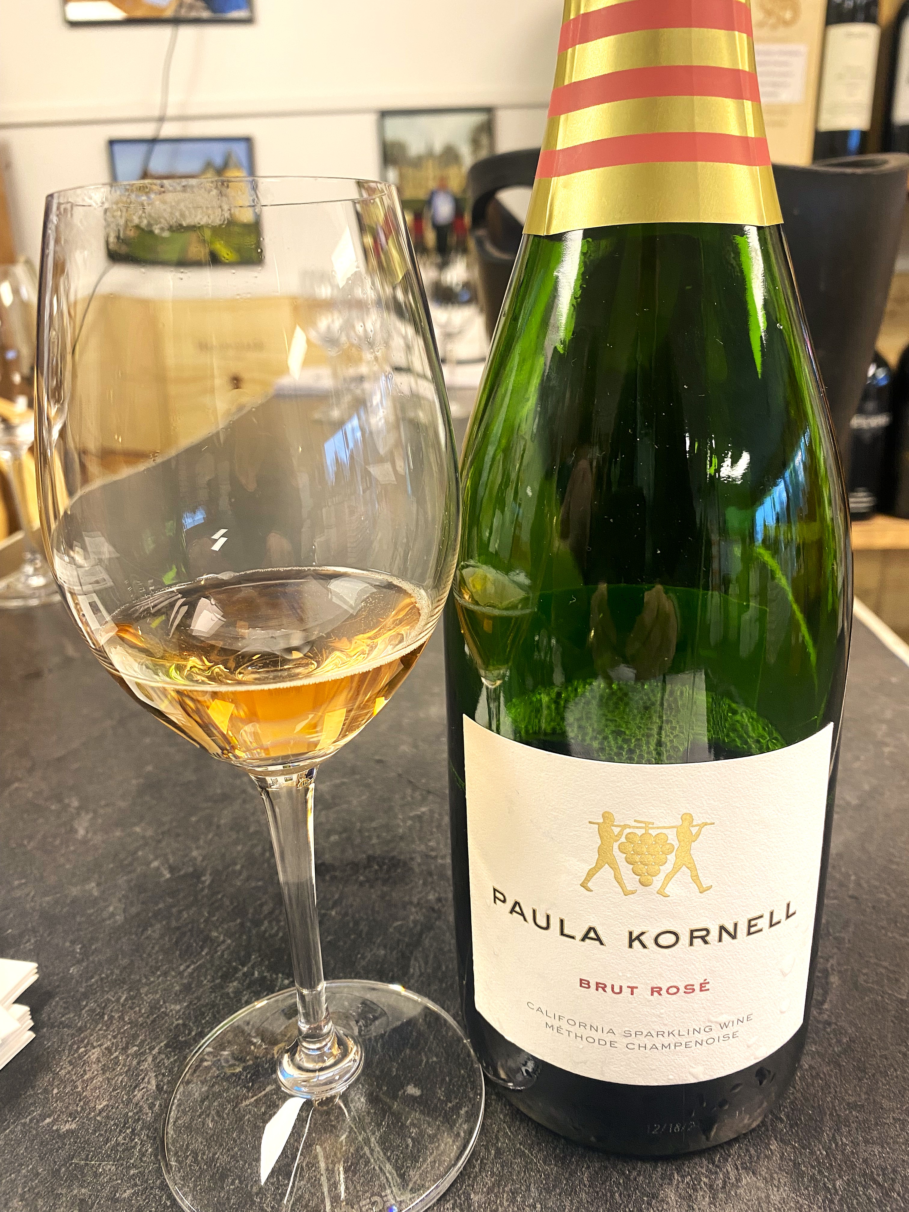 We then had their second non-vintage sparkling wine, Paula Kornell Brut Rosé California Sparkling Wine NV. This is a multi-vintage blend of seventy percent Pinot Noir and thirty percent Chardonnay using the classic Methode Champenoise. The wine was aged for thirty-eight months on fine lees in the bottle and then an additional several months after the disgorgement. A pretty salmon-pink colored wine with persistent small bubbles offered notes of strawberry, raspberry and watermelon along with wet stones. On the palate this medium-bodied, well-balanced wine displayed tones of currants, cranberries, pomegranate seeds and tart cherries followed by lively acidity, a creamy mousse and ending with medium-count finish of fruit, terroir and some toasted hazelnuts.